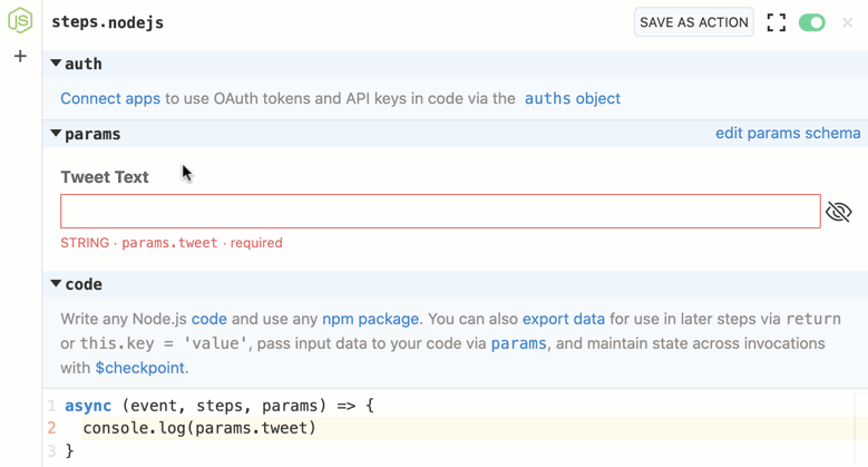 Expressions make it easy to pass data exported from previous steps into a code step or action via params. For example, if your workflow is triggered on new Tweets and you want to send the Tweet content to an HTTP or webhook destination, you would reference {{event.full_text}} to do that.